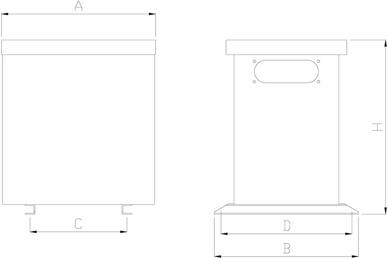 | S (kva) | kotelo | a (mm) | B (mm) | C (mm) | D (mm) | H (mm) | Ø (mm) | m (kg) |