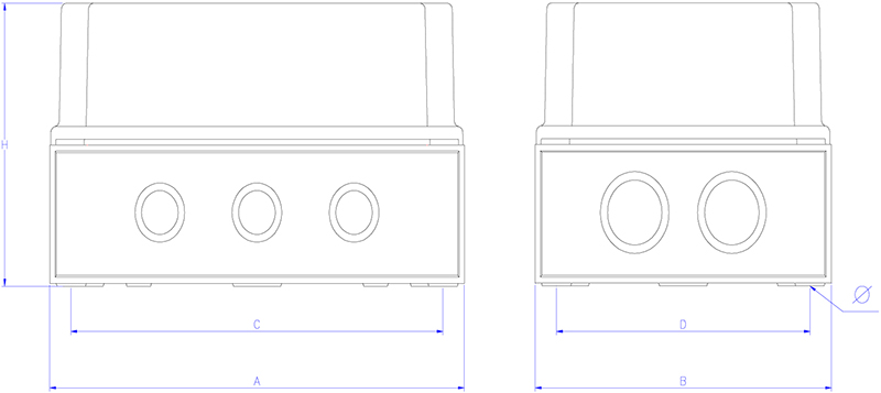 Nämä kotelot ovat lämmönkestävää muovia ja irroitettava kansi on varustettu tiivisteellä. Koteloissa on valmiina aihiot läpivientiholkeille. Koteloihin voidaan asentaa roiskevesitiiviitä sulakepesiä tai ylivirtasuojia.