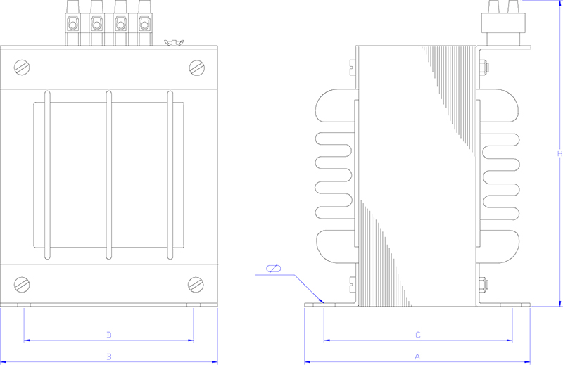 | Power [VA] | Core | A [mm] | B [mm] | C [mm] | D [mm] | H [mm] | Ø | Weight [kg] | ΔU | ΔS |